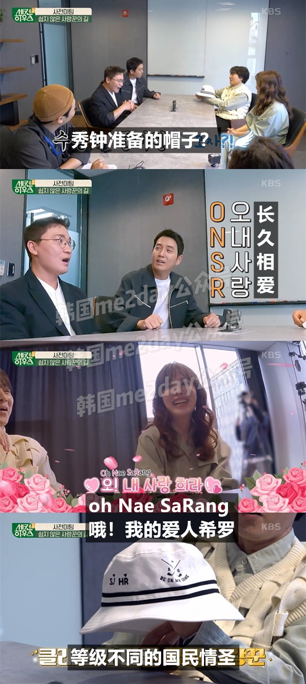 当天朱相昱一登场就对崔秀钟&夏希罗夫妇表示了尊敬,因为崔秀钟带着绣有“SJ HR(两人名字的缩写)”、“ONSR(长久相爱)”等字母的帽子,无时无刻都在展现着自己对妻子的爱意。