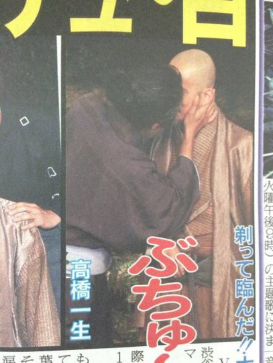 两人共演了《军师官兵卫》后,在片场举行记者会时,其他共演者只对着冈田亲脸颊、亲额头,唯独高桥小哥照着嘴就亲了上去……