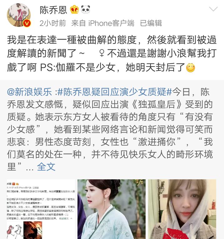 被称为“偶像剧女王”的陈乔恩就是因为四十岁了还在演傻白甜总被吐槽,她发文回应质疑,指责对女性的一些不正当看待,感到可笑而悲哀,还呼吁要好好疼爱自己。