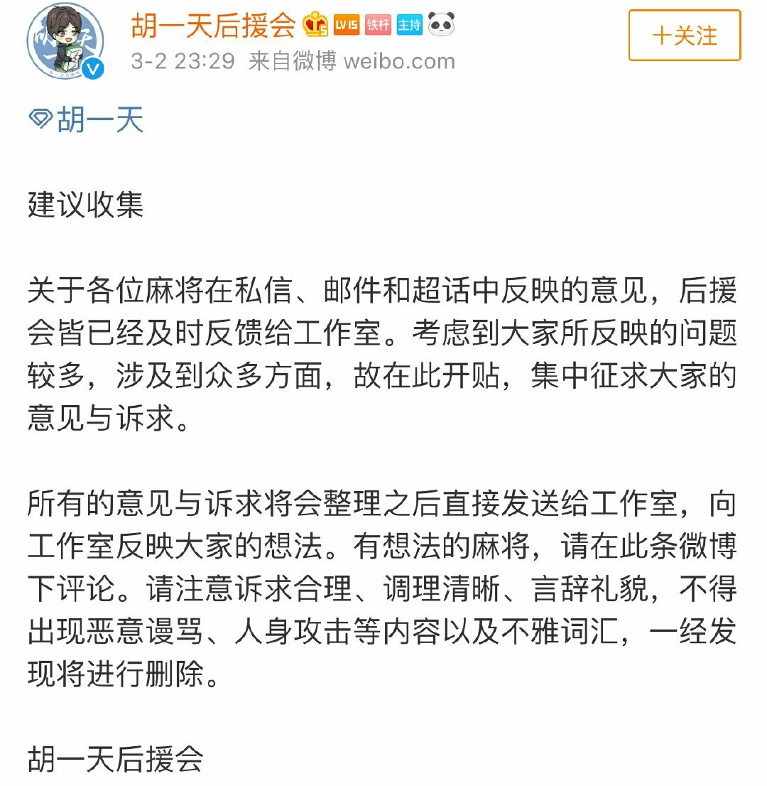 胡一天后援会因为爱豆在各app各网站的黑词条问题没有得到解决,直接开撕工作室,还要求正视粉丝诉求。