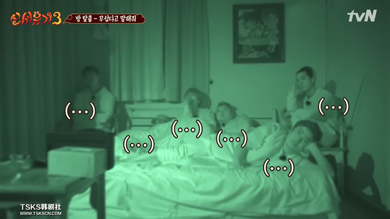 节目组的其他成员也是可爱满分,比如说这个音响导演小哥,为了检测妖怪们在房间是否发出声音,小哥需在房间外同步收看恐怖片。结果房间里的妖怪们一片淡定,小哥自己被吓得不行,表白小哥旁边的妹子,也是淡定地不行,女汉子一枚。