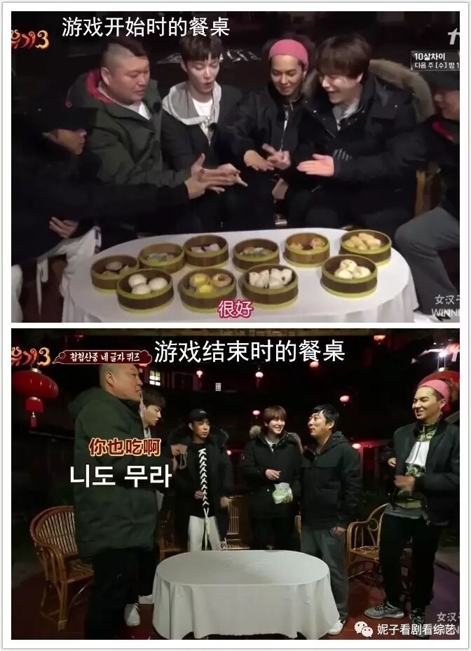 来到中国,怎能不尝尝中华美食?自古民以食为天,节目组费劲心机地围绕着吃饭设置了各种游戏,其中最为经典的就是吃饭前快问快答,答题范围涉及四字词语、俗语、人物、品牌等,每一轮从头到尾再到头,成员依次回答,3秒中答不上来,PD就会愉快地喊“叮”,然后撤去一个菜,如此重复,直至任务胜利或者无菜可撤(基本上都是第二种结局)。这个环节真的是展现了每个人都具有黑洞的潜力,各种大写的懵。每次都心疼镜头里的member,眼睁睁地看着菜一道一道减少。