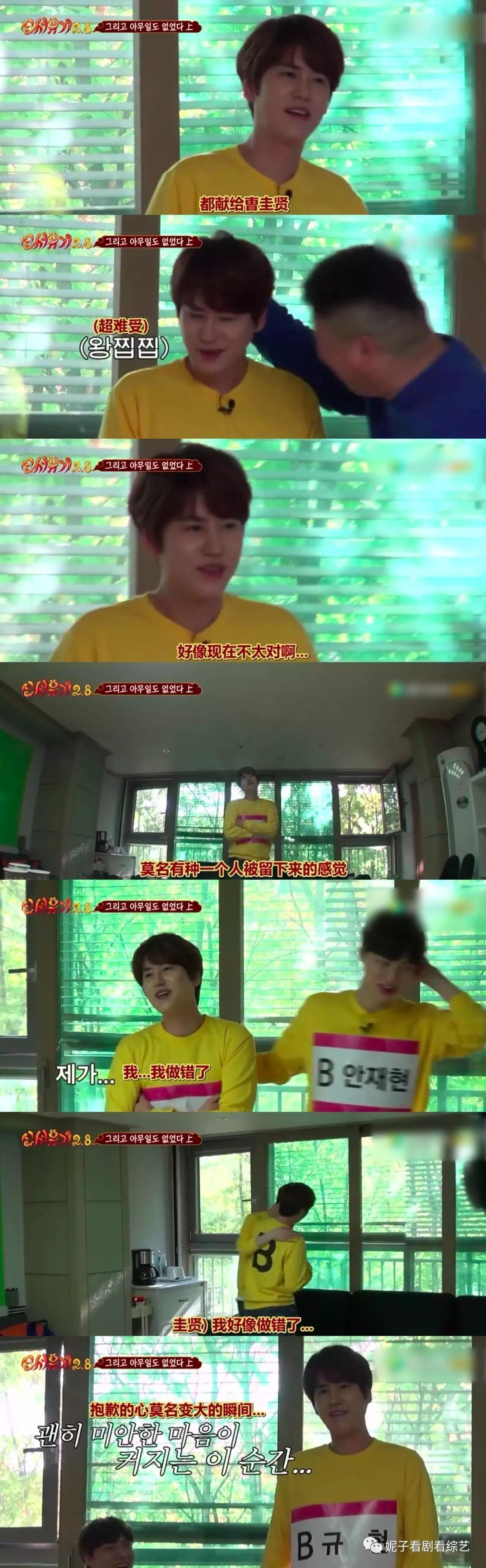 在和节目组的赌注中,自己赢了游戏,导致拍摄提前结束,圭贤像个做错事的孩子,不知所措,闷闷不乐,甚至还发短信给公司高层,表示自己可能做错了事情。