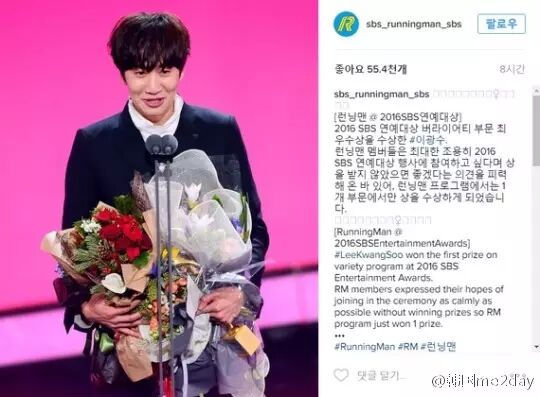 之前一直有粉丝担心,由于和拍摄时间冲突,猜测《Running Man》节目组能否参加2016年SBS演艺大赏。在昨天(25日)晚上SBS演艺大赏中,李光洙获得了“最优秀奖”。发表获奖感言时他刚开口说“我也不知道该怎么说获奖感言”之后就红了眼眶,台下的宋智孝也忍不住的擦眼泪。