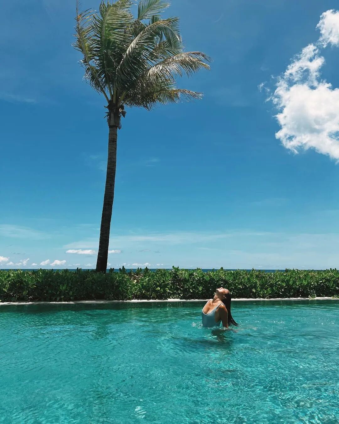 这一张更是没谁了,乐基儿在泳池大秀身材,她换了一身白色的吊带泳衣,看起来就像是出水芙蓉一般,再配合着这个美丽的环境,真的是绝了。