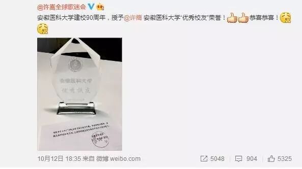 去年安徽医科大学建校90周年,还授予了许嵩“优秀校友”的荣誉。