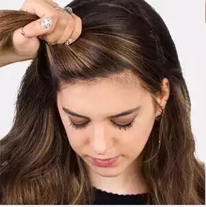 Step2:从一侧拿起最上层的分成三等分编麻花,在编的过程中,将剩余头发逐次加入向耳后编织。