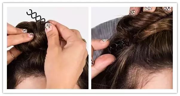 缠绕成丸子形状,用螺旋发夹在图示处固定即可。