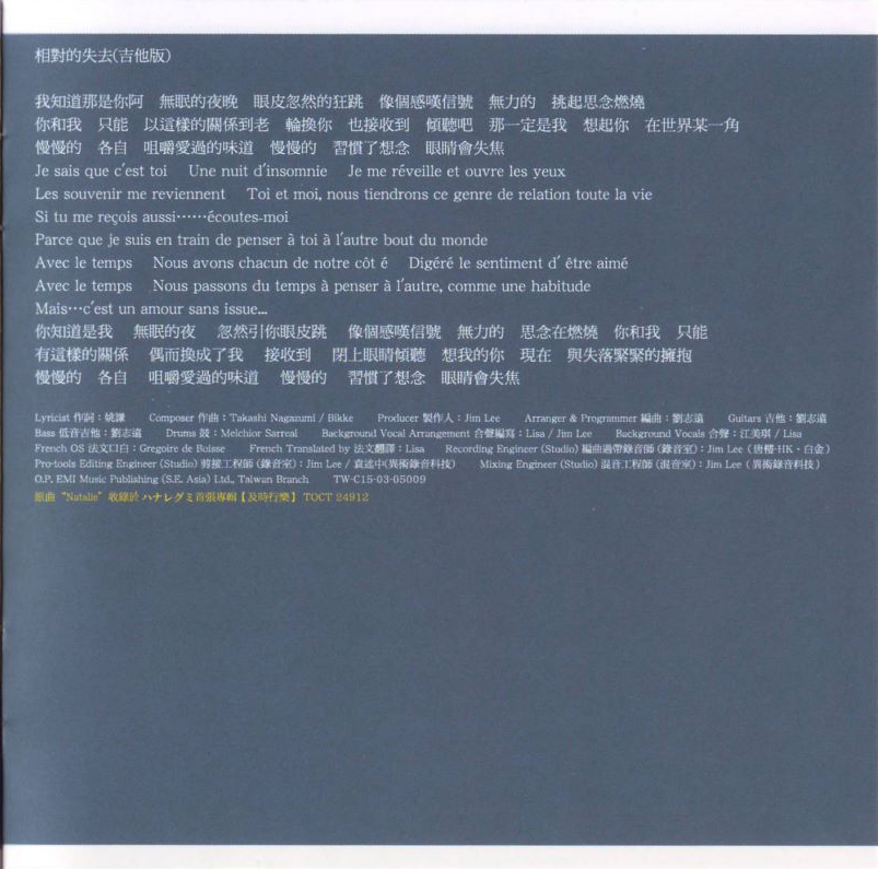 《相对的失去》这首歌在专辑里分别收录了以吉他、钢琴两种乐器为主要编曲思路的版本。开篇的钢琴版比较抒情、吉他版则是Indie Pop的味道。同样的旋律,两种编曲,但是不会给人“凑数”的感觉。甚至歌词内页还贴心标出了日语原曲及所在唱片信息……估计是同为EMI的缘故。