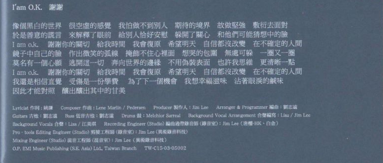 专辑的另一主打歌《I’m OK谢谢》是改编自挪威歌手Lane Marlin的《Disguise》。其实这也不是姚谦第一次选择Lane Marlin的歌给自己旗下歌手改编,维京唱片出品的另一张名盘《林忆莲‘s》里面那首《我坐在这里》就是来自Lane Marlin的《Sitting Down Here》。据说维京为了这首歌的MV,不惜斥资百万,请到了王家卫旗下的韩国艺人Sunny BAE出演。Sunny专程从韩国飞来飞去拍江美琪的MV,之前他曾学过半年中文,可用和江美琪完成简单的沟通。MV的拍摄地在宜兰,为了捕捉到满意的海景,拍摄团队还特意在改编驻足停留了几个小时,只为了拍到MV中需要的画面。