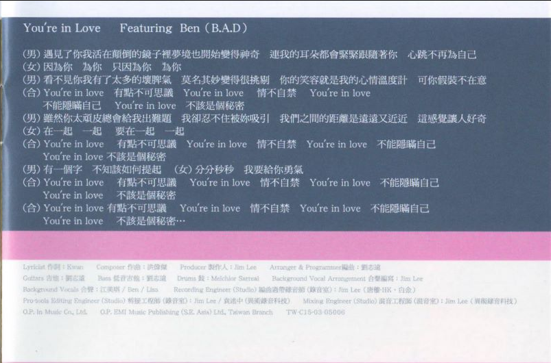 专辑中还有江美琪与百代旗下的男子组合B.A.D的成员Ben(不是我,这个Ben叫白吉胜)合唱的《You're in Love》。我最早知道他们是因为他们翻唱过草蜢的《半点心》。