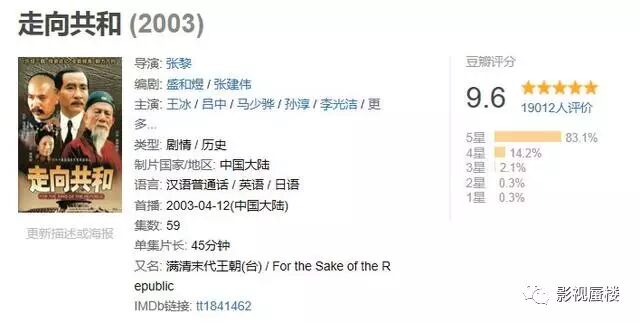 《走向共和》在豆瓣的评分高达9.6,位居国产剧第一。该剧鸿篇巨制,荡气回肠。片中很多情节都是真实的历史再现,而且演员的相貌也与历史人物惊人相似,可以说是精品中的最精品。