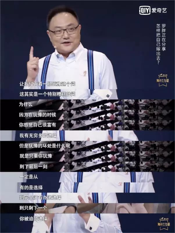 这就是爱奇艺硬派脱口秀《知识就是力量》中主讲人罗振宇所说的,在现代未婚女性面前最大的障碍和困扰就是犹豫。