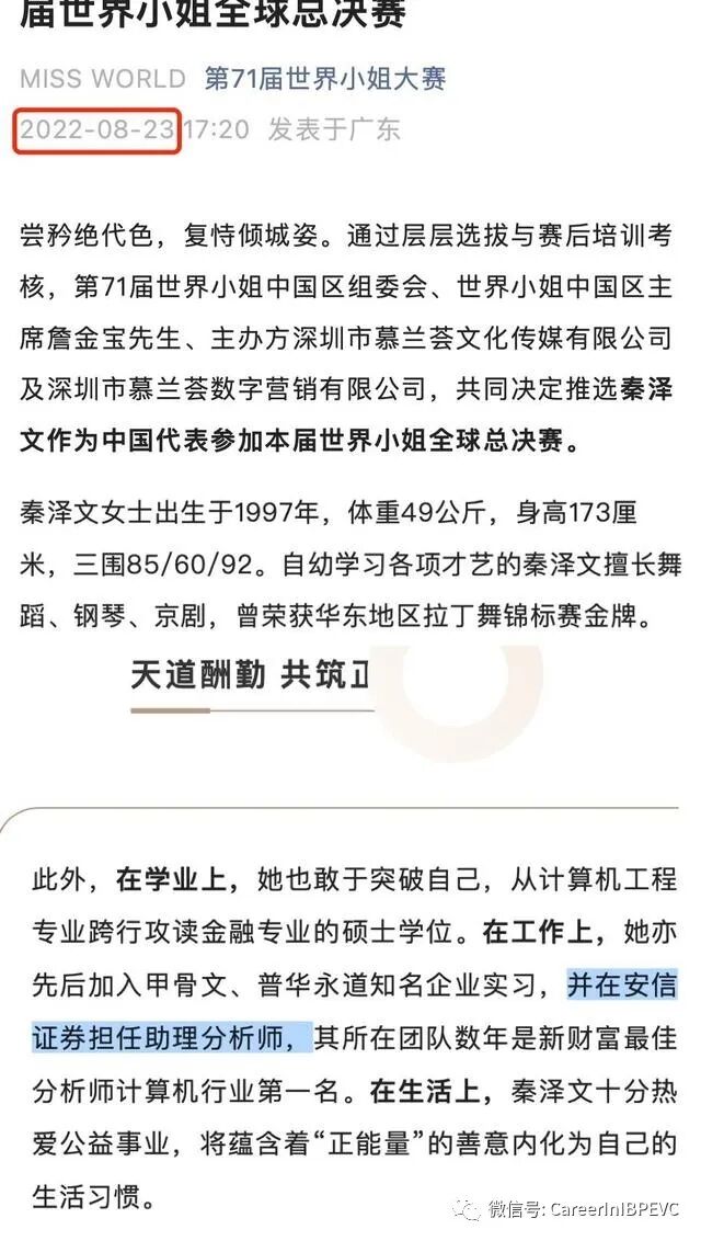 据第71届世界小姐大赛官方微信披露的消息显示,秦泽文曾在安信证券担任助理分析师,其所在团队数年是新财富最佳分析师计算机行业第一名。据了解,该团队就是彼时的安信证券胡又文团队。据了解,自2016年9月,原安信证券研究所所长赵晓光离职之后,时任计算机行业首席分析师的胡又文继任,成为当时业内最年轻的研究所所长之一。去年,胡又文从安信证券离职加盟民生证券,现任民生证券副总裁、研究院院长。