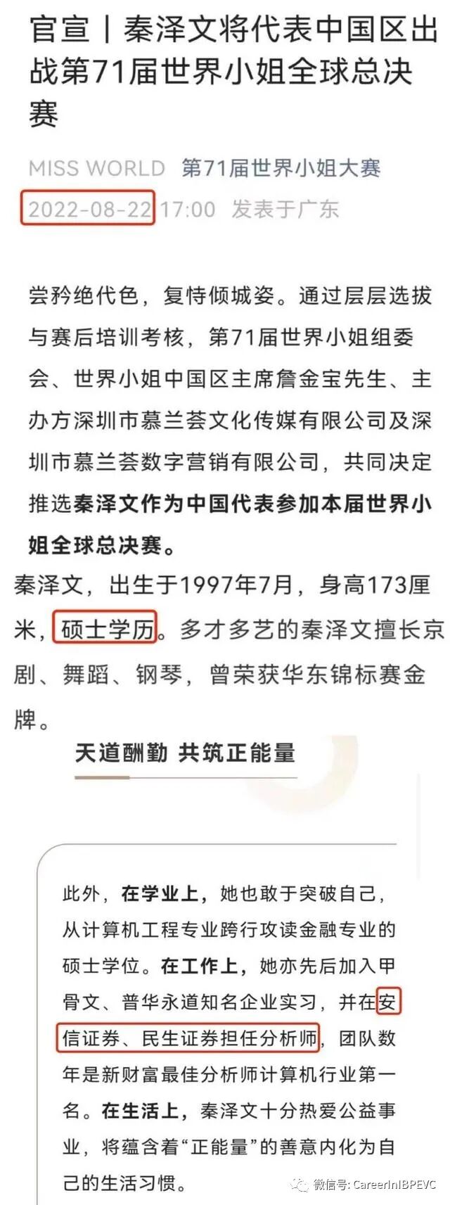 就在吃瓜群众羡慕秦泽文集智慧与美貌于一身时,网络上关于秦泽文学历及从业经历涉嫌造假的讨论也逐渐增多,而这从世界小姐大赛官方删除8月22日推送和重新于8月23日发布新版推送或可印证。