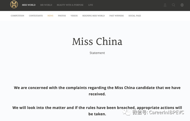 值得一提的是,除了学历、从业经历外,秦泽文并非第71届世界小姐中国区前三名,这也引发网友对于其疑似“空降”递补参加世界小姐总决赛的质疑。世界小姐官网8月24日发布声明称,对收到的有关世界小姐中国区候选人的投诉表示关注,并将调查此事,如果违反规定,将采取适当行动。