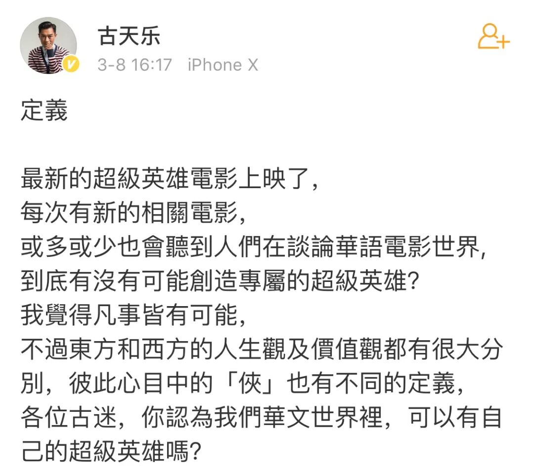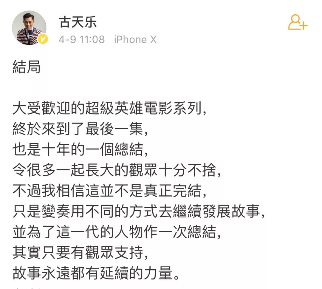 最近,古天乐发了一条微博,感慨《复仇者联盟》大结局: