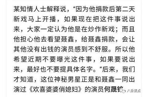 对于捐款这件事诸多好友纷纷赶来感慨解囊,何晟铭就是其中一位捐款的,两人合作过电视剧,所以也是有些交情的,在得知聂鑫去世之后,何晟铭就悄无声息的捐了25万,并且要对方不要宣传,原因是因为捐款后的第二天,是他的新戏《欢喜婆婆俏媳妇》上映,而他害怕媒体说他是为了新戏炒作,也在意不想让那些没捐钱的人心里不舒服,所以不要声张。但其中有些人不仅未捐款还借机炒作,让粉丝们心寒不已,而这个人就是杜淳。