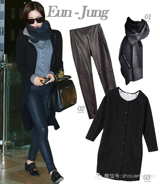 T-ara成员咸慇晶主要以能够吸收太阳光的灰色和黑色等单色系单品,打造了帅气酷感。一身灰色T恤搭配皮肤,把黑色大衣作为外搭单品,将另类时髦的帅气魅力展现的淋漓尽致。