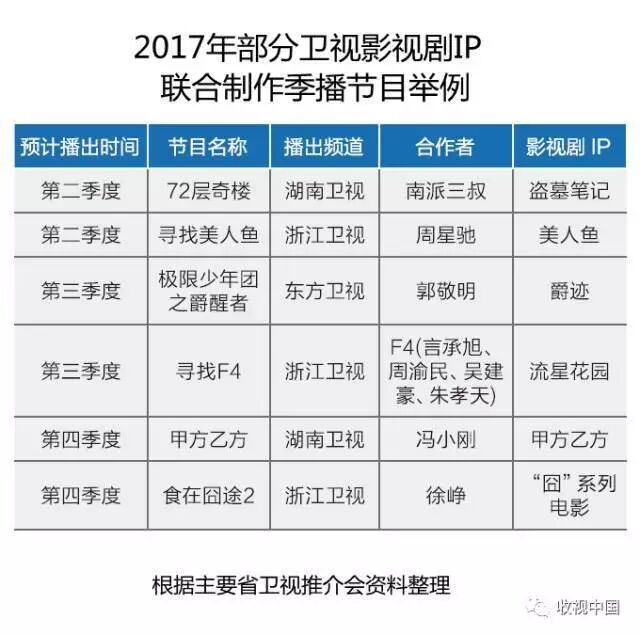 如湖南卫视悬疑类户外真人秀《72层奇楼》就是湖南卫视联合《盗墓笔记》作者南派三叔共同开发制作的新季播节目,还有浙江卫视与徐峥合作的《食在囧途》、上海东方卫视与郭敬明合作的《极限少年团之爵醒者》等节目都是将影视剧题材作为节目开发源泉,与大牌导演或作者进行共同开发,联合专业制作公司进行后期开发,但这种联合制作方式在国内还处于摸索发展阶段。