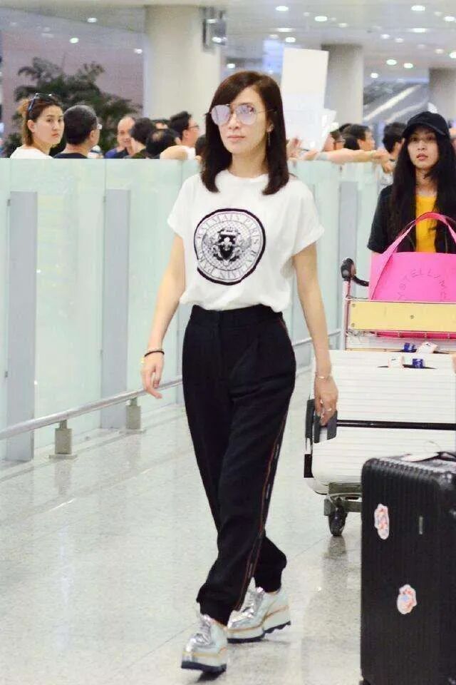 不得不说佘诗曼穿鞋唯一不会出错的就是简单的长裤配着运动鞋了,不过别看女神 简单的上白下黑普通要清爽,看着就像是邻家小姐姐一样 ,但这台阶鞋小心机里还是拔高了身高呀 ,