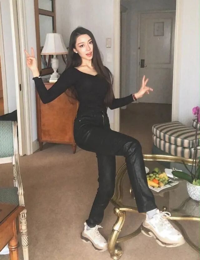 这一身黑色的套装把身材的优势就完全给凸显出来了,整体看起来就是那种长手长脚的,妥妥就是一个大美女啊,她的妆的话,这样画一下,更有那种欧美的感觉,显得更加的不一样,更加的大气。