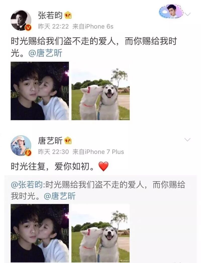他们在去年八月公布恋情,张若昀在微博上深情告白唐艺昕:时光赐给我们盗不走的爱人,而你赐给我时光。