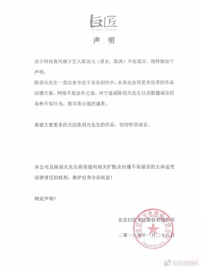 中午11时左右,陈羽凡所在的公司巨匠文化发出声明,表示将对传播不实谣言的主体保留追究法律责任的权利,维护自身合法权益。