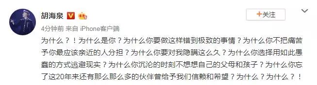 胡海泉微博全文:“为什么?!为什么是你?为什么你要做这样错到极致的事情?为什么你不把痛苦予你最应该亲近的人分担?为什么你要对我隐瞒这么久?为什么你选择用如此愚蠢的方式逃避现实?为什么你沉沦的时刻不想想自己的父母和孩子?为什么你忘了这20年来还有那么那么多的伙伴曾给予我们信赖和希望?为什么?为什么?! ”