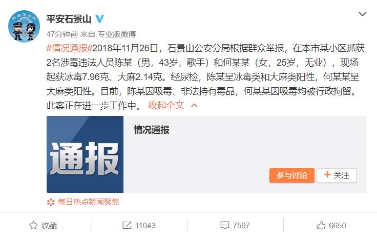 今天下午1时许,北京市公安局石景山分局官方微博@平安石景山 发布通报: