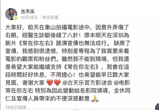前段时间,古田在微博发文告知网友,在象山拍摄电影《常在你左右》的途中右眼受伤,缝了八针,发微博的第二天本是电影在深圳的路演,而古天乐因为眼伤而未能参加,对于缺席宣传一事古天乐真诚地向大家表示道歉。并在最后还不忘为这部电影做一下宣传。