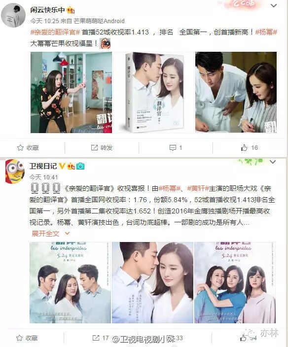 《翻译官》和《柠檬初上》对比呢,无论是收视率还是市场份额,大幂幂比刘恺威都强一倍。