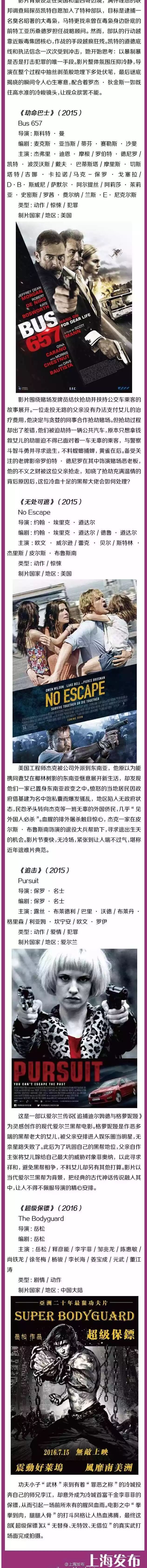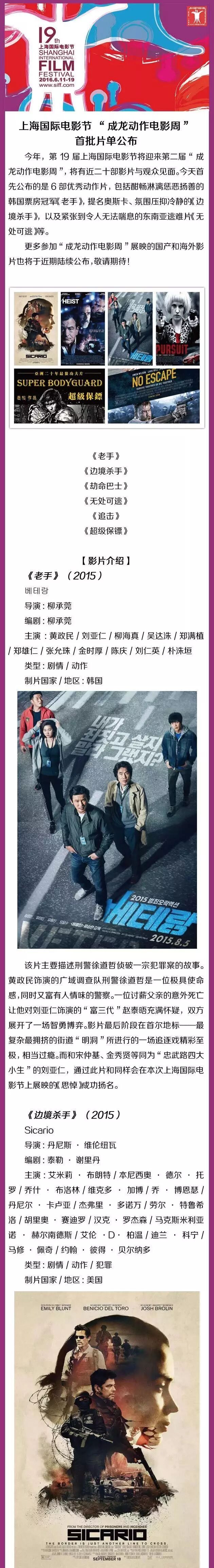 @上海国际电影节 说,今年电影节将迎来第二届“成龙动作电影周”,近20部影片将与观众见面。目前公布的6部优秀动作片包括:《老手》、《边境杀手》、《劫命巴士》、《无处可逃》、《追击》和《超级保镖》。更多国产和海外影片也将于近期陆续公布!