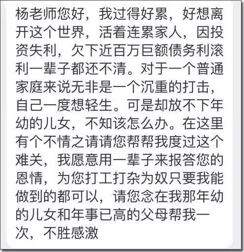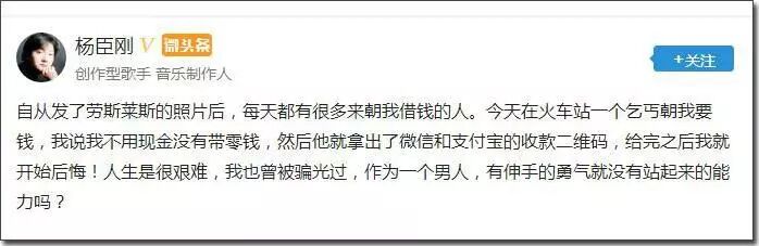 吃一堑长一智,相信杨臣刚已经汲取了教训,现在不会再轻易上当了。所以,那些“借”钱的兄弟们,应该可消停下了。当然,我也相信其中个别人可能说的是实情,确实需要钱,但这世界上,和你、和小编我一样需要钱的人真的太多,与其寄希望于这种不劳而获的方式,不如靠自己双手去努力。正如杨臣刚说的,作为一个男人,有伸手的勇气,就没有站起来的能力吗?