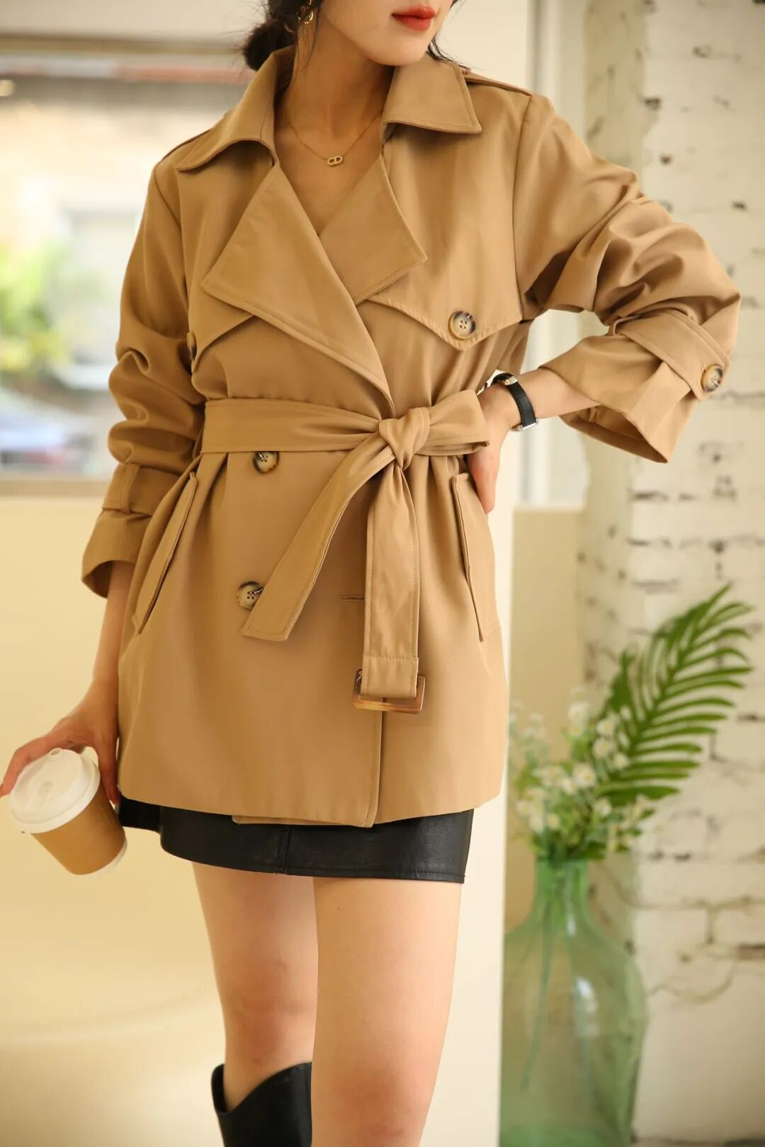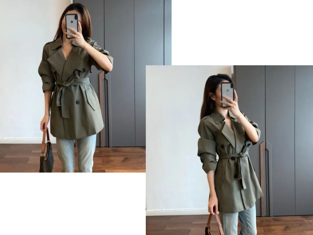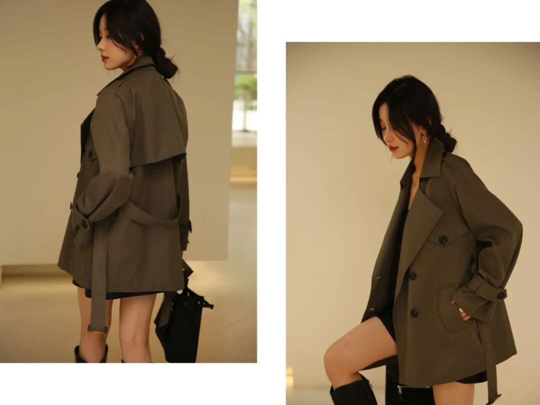 短款的话,其实欧欧个人更建议绑起腰带穿哦,视觉掐出腰线来,显腰细腿长,风衣也能穿出女人味。