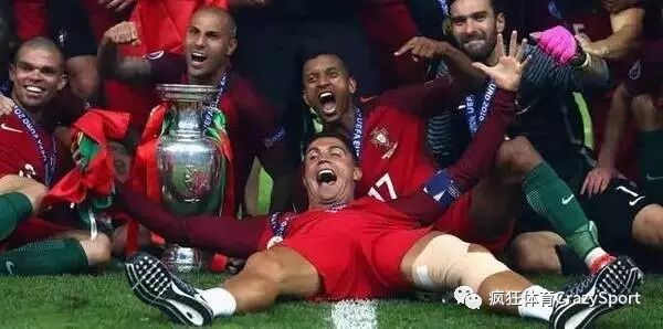 决赛刚刚打了24分钟,C罗就膝盖受伤被抬出了场外,还好队友们比较给力,于是他也实现了"躺"冠。