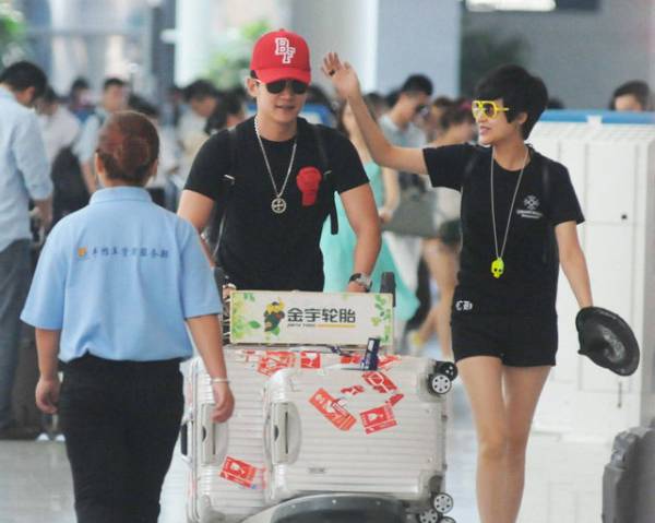 炫夫狂魔蔡少芬和张晋出现在机场一般是一前一后,行李老公拿↓