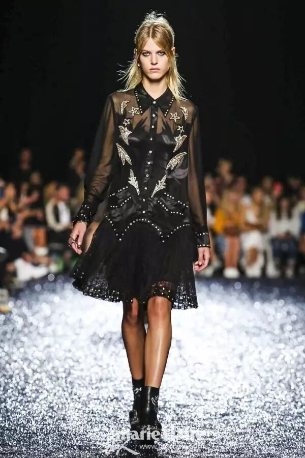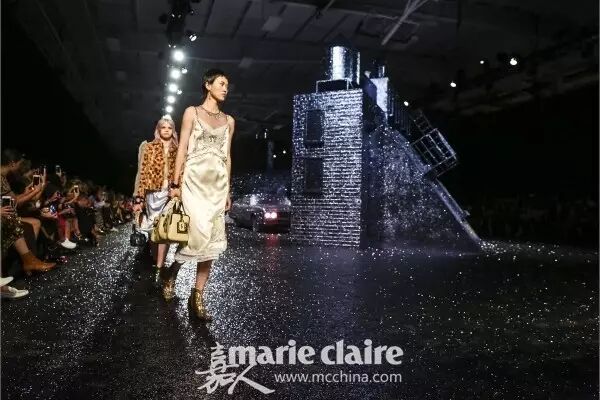 此次时装秀选址于纽约Basketball City,将纽约的街景用迤逦暗黑的风格复制到秀场,充满城市音律的音乐配合着模特们的着装,营造出一个熠熠发光的午夜派对景象。