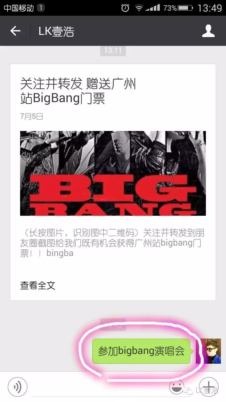 获奖的朋友,我们会 微信+电话 通知。所以请转发此内容,截图发给LK壹浩后,务必给LK壹浩文字留言,写上 “姓名 + 电话 + 参加bigbang演唱会”。
