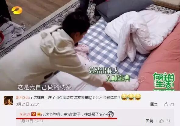 但是看了李冰冰在节目里的分享,小辣发现睡眠不好并不都是心理的原因,即使没有空虚寂寞冷,寝具不舒服也会失眠。比如李冰冰本人,在睡觉之前“布阵”的关键就是枕头,把脖子托得舒服了才行,她如果不用自己特制的枕头就会失眠。