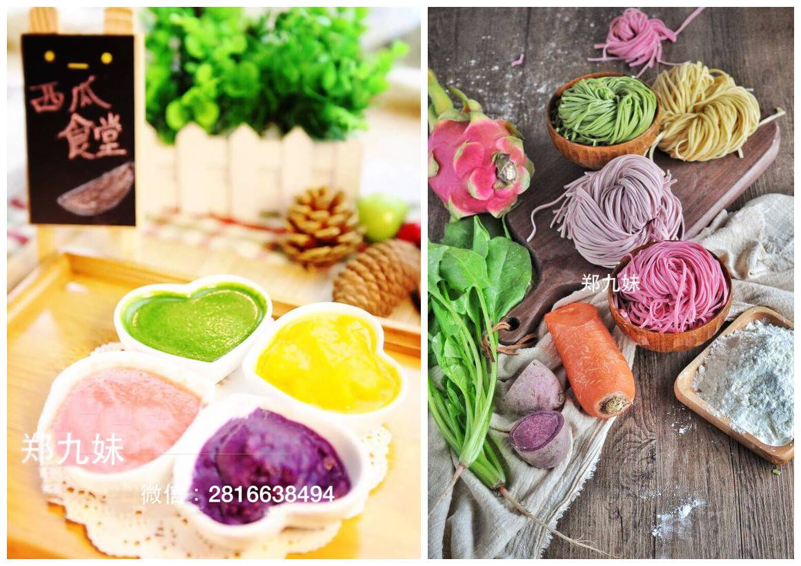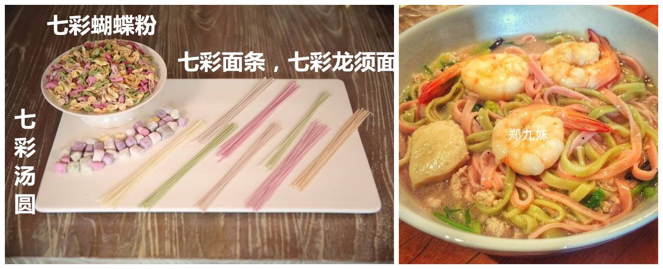 蔬果粉面类:七彩汤圆,蔬菜水果蝴蝶面,蔬菜水果面条,蔬果龙须面,采用红火龙果,紫薯,菠菜,黑芝麻,南瓜,香芋等制作,无任何添加,安全健康。