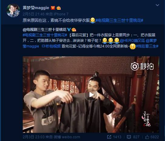 在“素锦”为“夜华”更衣的一场戏,黄梦莹傻傻分不清楚袖子在哪里,好几次尝试失败之后,被赵又廷吐槽“嫁嫁嫁的出去吗?”哈哈哈哈哈,姑父你不要这样嘛~