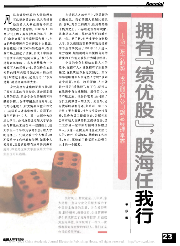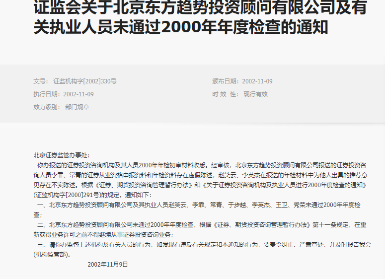 当时赵笑云背后的操盘手正是这位李飞。当时叫李霏,1997年中央财经大学研究生毕业后,就进入赵笑云的东方趋势,到2000年已经成了副总经理,扬言灵活的人才机制才有了东方趋势的一战成名。只是很遗憾,李霏跟他的老板赵笑云在股评的道路上一直裸奔,没有通过年度检查,还在2002年被证监会通报。当然,赵笑云的黑嘴功劳簿上,有李霏的辛勤汗水。