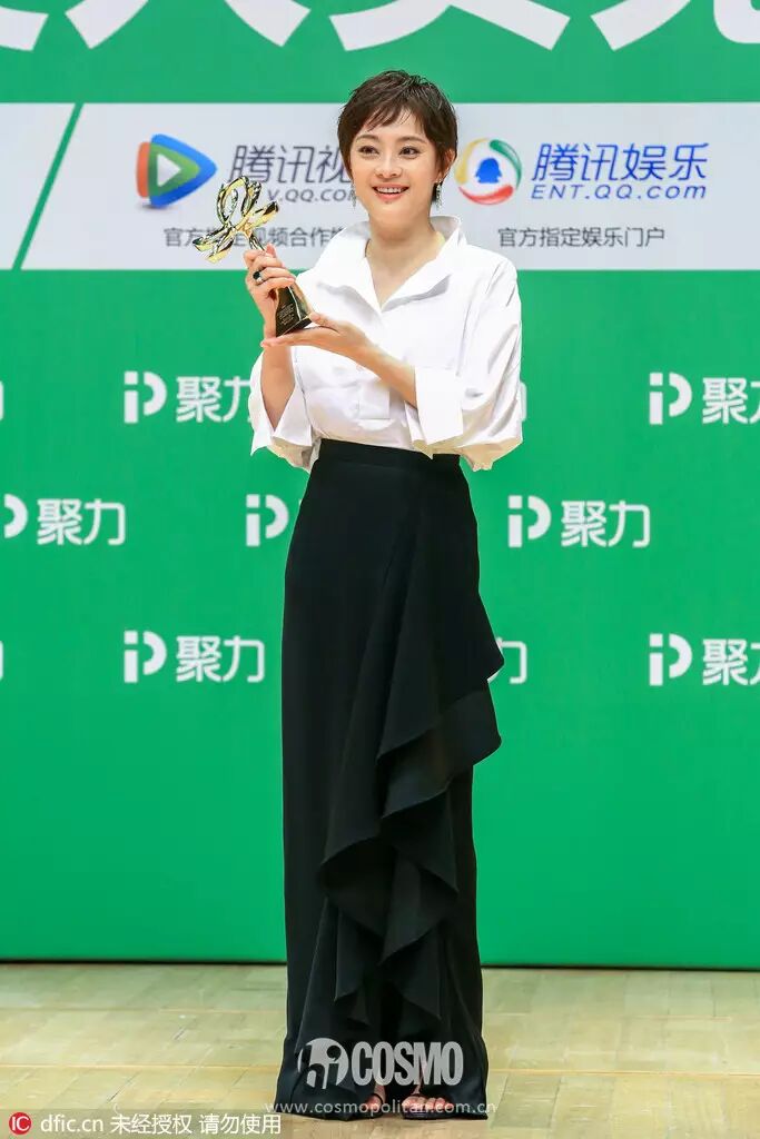 白衬衫搭配一条荷叶边长裙,手捧奖杯的孙俪笑的淡定从容,仿佛还是那个《幸福像花儿一样》里的她。