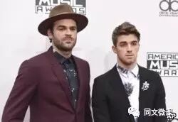 Alex Pall, left, and Andrew Taggart, of The Chainsmokers, arrive at the American Music Awards at the Microsoft Theater in Los Angeles.