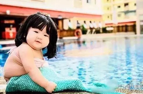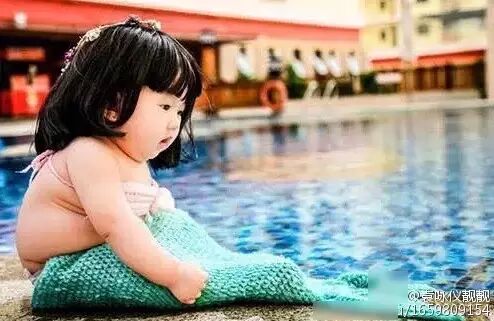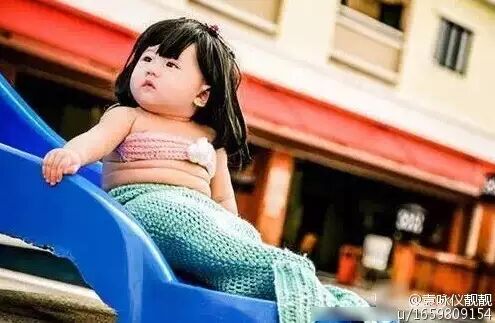 照片上的萌娃穿上美人鱼的尾巴,胖乎乎的十分呆萌。