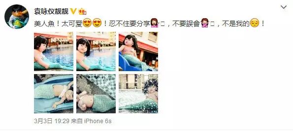 小朋友长相可爱,被赞是“史上最萌美人鱼”,袁咏仪也感叹“太可爱!忍不住要分享!不要误会,不是我的!”