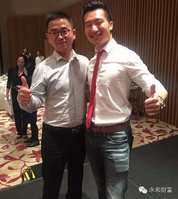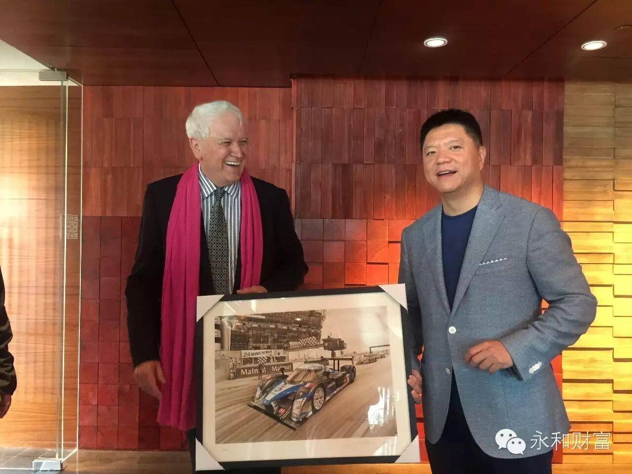 图为:永和财富创始人/总裁罗汉林与著名华裔赛车手程飞合影