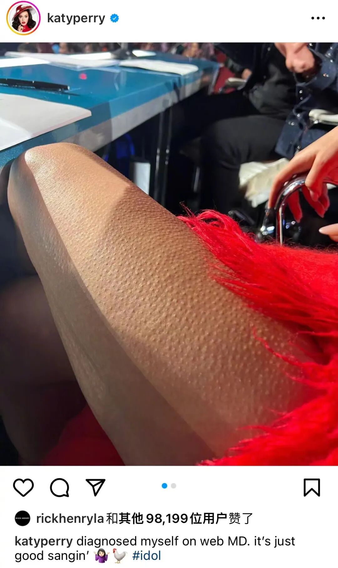 鸡皮肤,学名叫毛周角化症。“鸡皮肤”是一种基因导致的体质。具有这种体质的人,毛囊周围的角质会增厚,导致毛囊口被过厚的角质堵塞,形成一粒粒的小凸起。它最常出现的部位,是在上臂外侧、大腿、颈部,甚至整个背部、脸颊——有些人腮帮子皮肤会颜色较深、也较粗糙,虽然颗粒状不太明显,但是也属“鸡皮肤”。很多人身上皮肤的毛孔,都会有那么一点一点发红的小凸起,更严重些的,毛孔颜色会变深,呈现暗红或褐色,颗粒也会更粗糙,看起来很像是鸡皮疙瘩,它最常出现的部位,是在上臂外侧、大腿、颈部,甚至整个背部、脸颊——有些人腮帮子皮肤会颜色较深、也较粗糙,虽然颗粒状不太明显,但是也属“鸡皮肤”。“鸡皮肤”不痛不痒,也不会病变,只是特别干燥、会起屑,还会影响美观。秋冬季节皮肤的角质增厚,“鸡皮肤”也就显得更严重,有的甚至会呈现“鱼鳞病”的症状——这听起来好像很可怕,其实它只是极度干燥引起的、使皮肤呈现像一片片鱼鳞似的肤色不均,很多人呈现这种症状还不自知呢。另外,“鸡皮肤”也与维生素A缺乏有关,可适当服用维生素AD丸,或者在相关位置涂抹维A酸软膏。其实 Katy Perry 确实不是一个皮肤细腻的如丝绸的小姑娘。她的皮肤不算很好,但是她确实很美。 是我心中的顶级美女。爱 Katy Perry,我就是 Katy Perry 的粉丝。