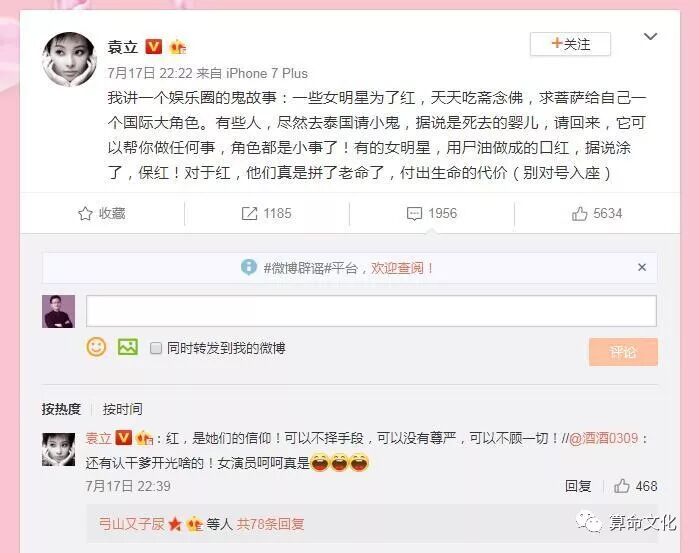 2018年7月17日晚上22点22分,著名演员袁立在微博爆料了一条消息:“我讲一个娱乐圈的鬼故事:一些女明星为了红,天天吃斋念佛,求菩萨给自己一个国际大角色。有些人,尽然去泰国请小鬼,据说是死去的婴儿,请回来,它可以帮你做任何事,角色都是小事了!有的女明星,用尸油做成的口红,据说涂了,保红!对于红,他们真是拼了老命了,付出生命的代价(别对号入座)。”
